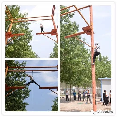 從一開始的團(tuán)隊(duì)破冰,到考驗(yàn)智慧和勇氣的互動(dòng)游戲,大家相互配合、彼此信任,英姿颯爽、奮力拼搏。在“高空斷橋”項(xiàng)目中,隊(duì)員們爬上8米高空,躍過(guò)斷橋后折回,再?gòu)目罩薪德洹.?dāng)有隊(duì)員面對(duì)高空遲疑害怕時(shí),其他隊(duì)員都紛紛加油鼓勁,耐心等待,傳遞著集體溫暖的力量,最終所有隊(duì)員都順利完成了挑戰(zhàn)。